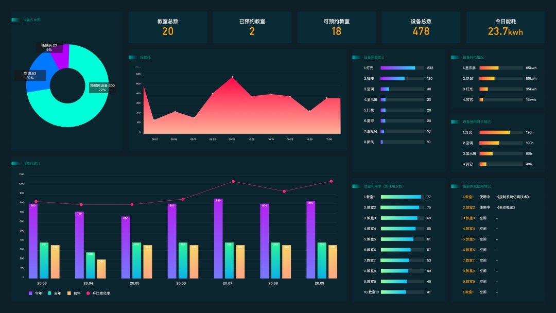 強(qiáng)智智慧教室還可對(duì)教室的溫濕度與空調(diào)、光照度與燈光、幕布/窗簾等教學(xué)環(huán)境進(jìn)行監(jiān)測(cè),通過(guò)物聯(lián)網(wǎng)進(jìn)行統(tǒng)一調(diào)度,實(shí)現(xiàn)不同場(chǎng)景中顯示設(shè)備、傳感器、智能教學(xué)設(shè)備、一卡通、多媒體等設(shè)備的智能聯(lián)動(dòng)。