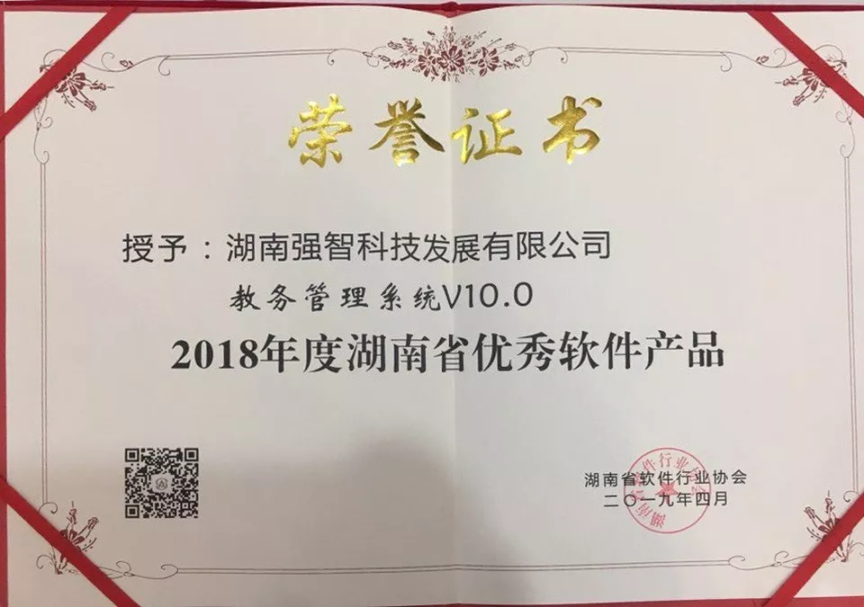 強(qiáng)智教務(wù)管理系統(tǒng)V10.0榮獲“2018年度湖南省優(yōu)秀軟件產(chǎn)品”。