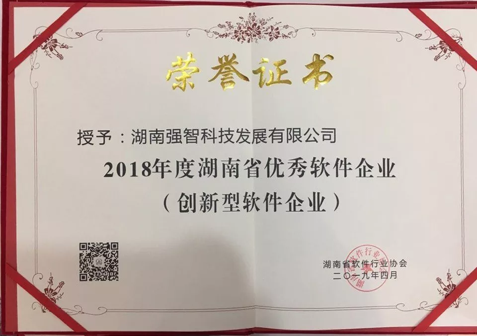 湖南強(qiáng)智科技發(fā)展有限公司榮獲“2018年度湖南省優(yōu)秀軟件企業(yè)”(創(chuàng)新型軟件企業(yè));