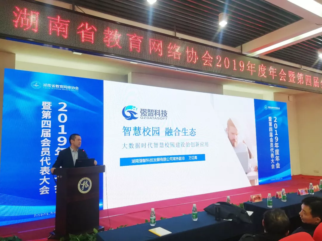 湖南強(qiáng)智科技發(fā)展有限公司作為協(xié)會(huì)會(huì)員單位參與此次會(huì)議,常務(wù)副總經(jīng)理萬見高先生發(fā)表《智慧校園 融合生態(tài)——大數(shù)據(jù)時(shí)代智慧校園建設(shè)的創(chuàng)新應(yīng)用》的主題演講。