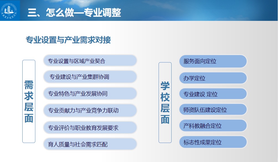 在進(jìn)行專業(yè)調(diào)整的時(shí)候,從需求層面來說,要以就業(yè)為導(dǎo)向培養(yǎng)技能人才,實(shí)現(xiàn)專業(yè)設(shè)置與產(chǎn)業(yè)的契合以及協(xié)同發(fā)展;從學(xué)校層面來說,專業(yè)建設(shè)、師資隊(duì)伍建設(shè)、產(chǎn)科融合等都需要準(zhǔn)確的進(jìn)行定位。