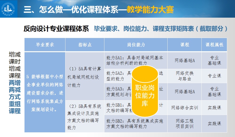 崗位能力決定了一門課程是否需要開設(shè),開設(shè)之后如何進(jìn)行教學(xué),教學(xué)的最終結(jié)果怎么樣……有了崗位能力的細(xì)分,就能夠去實(shí)現(xiàn)教學(xué)內(nèi)容的重構(gòu)以及教學(xué)方法、教學(xué)資源的建設(shè),并通過增減課時(shí)、增減課程實(shí)現(xiàn)教學(xué)體系的優(yōu)化。