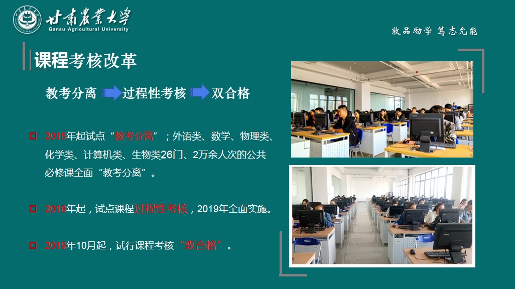 課程考核改革。學(xué)校已完成從“教考分離”到課程考核“雙合格”的改革,并對(duì)強(qiáng)化課堂教學(xué)進(jìn)一步提出了新要求、新挑戰(zhàn)。強(qiáng)智科技&甘肅農(nóng)業(yè)大學(xué)
