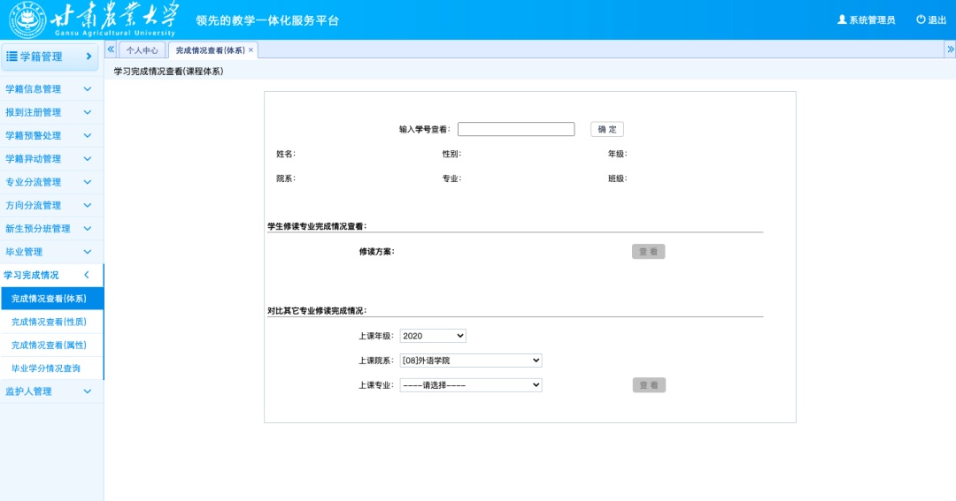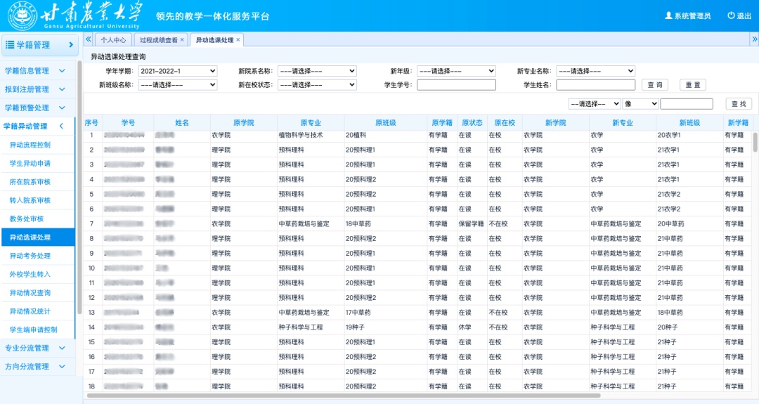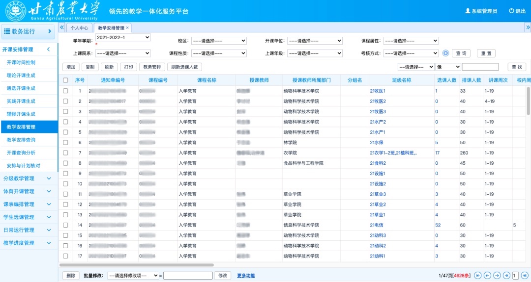 在學(xué)校變革發(fā)展的大背景下,強(qiáng)智科技攜手甘肅農(nóng)業(yè)大學(xué)定制開(kāi)發(fā)個(gè)性化、全流程的、具有農(nóng)林院校特色的本科教學(xué)管理系統(tǒng),系統(tǒng)根據(jù)學(xué)校專(zhuān)業(yè)動(dòng)態(tài)調(diào)整體系(專(zhuān)業(yè)評(píng)估指標(biāo))、人才培養(yǎng)三大模式、課程考核改革等策略建設(shè)教務(wù)系統(tǒng),為創(chuàng)新變革發(fā)展賦能,實(shí)現(xiàn)學(xué)校的教育改革目標(biāo)。第二階段