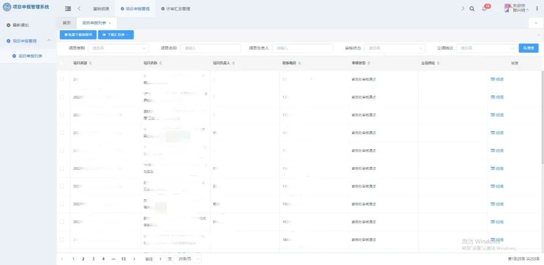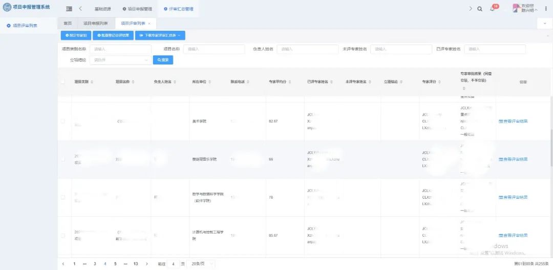 在2021年9月-12月期間的項目申報管理中,學校使用平臺累計完成了7大類項目申報、255條申報項目評審。