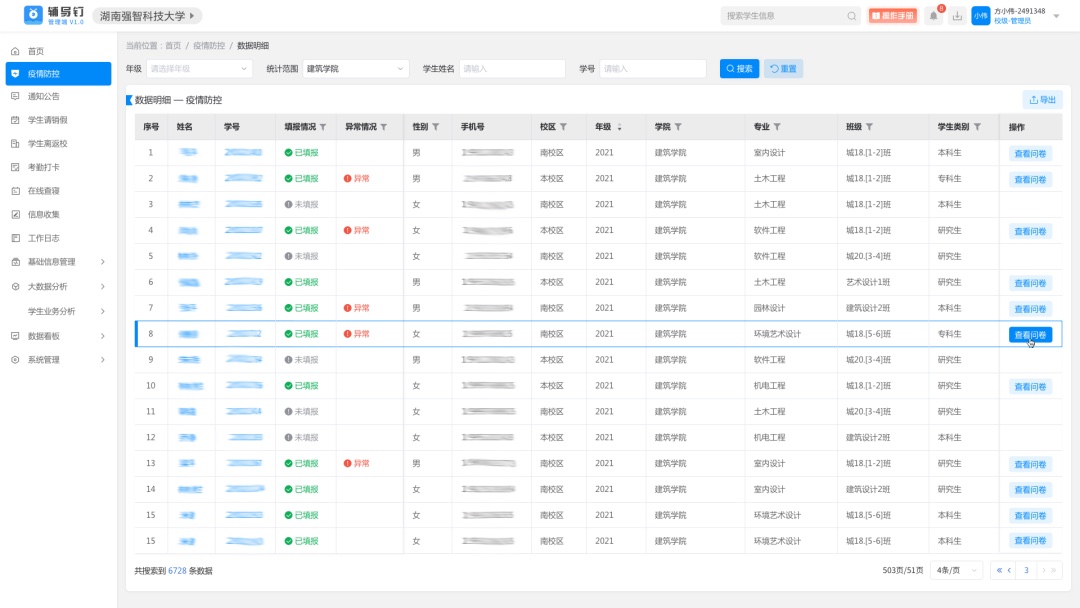 對(duì)疫情防控信息和學(xué)生健康數(shù)據(jù)進(jìn)行大數(shù)據(jù)分析與匯總,輔導(dǎo)員可隨時(shí)查看有異常情況的學(xué)生數(shù)據(jù),上傳異常情況處理記錄,并在線聯(lián)系異常狀況的學(xué)生,讓防控措施過(guò)程留痕,管理數(shù)據(jù)有據(jù)可依。