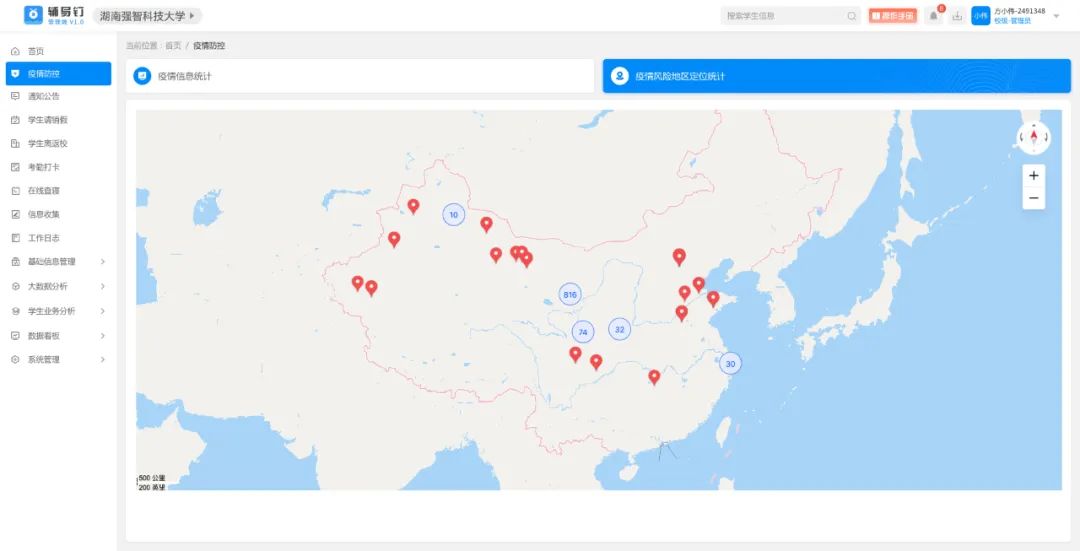系統(tǒng)將疫情信息統(tǒng)計(jì)與學(xué)生簽到定位數(shù)據(jù)相結(jié)合,實(shí)時(shí)展示動(dòng)態(tài)地圖信息,智能篩選出中高風(fēng)險(xiǎn)地區(qū)的學(xué)生定位,數(shù)據(jù)一目了然。