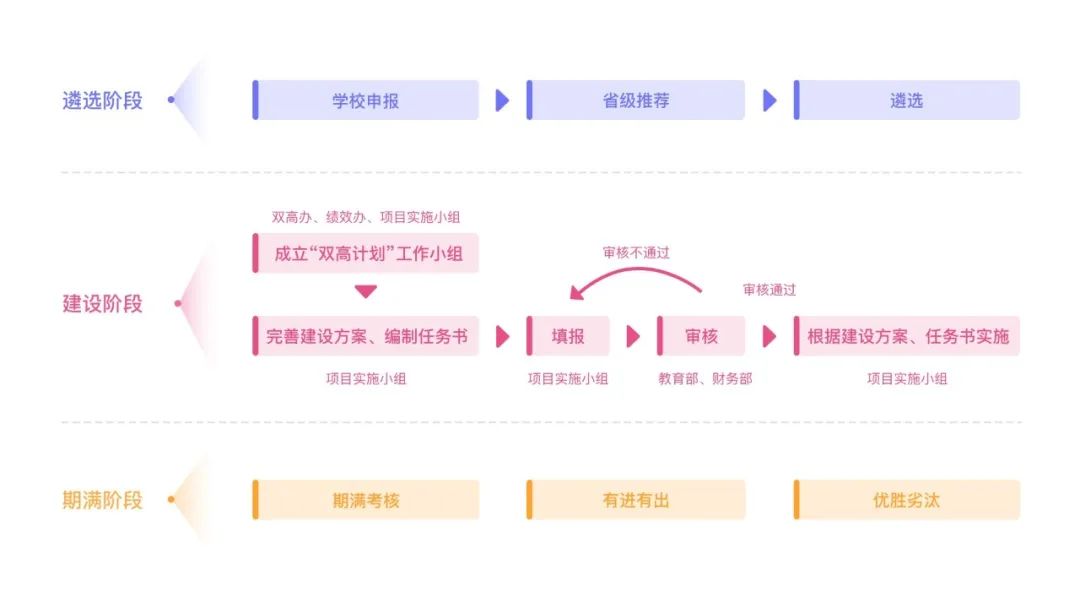 職業(yè)院校的雙高計劃實施推進流程分為3個階段:遴選階段、建設階段、期滿階段。