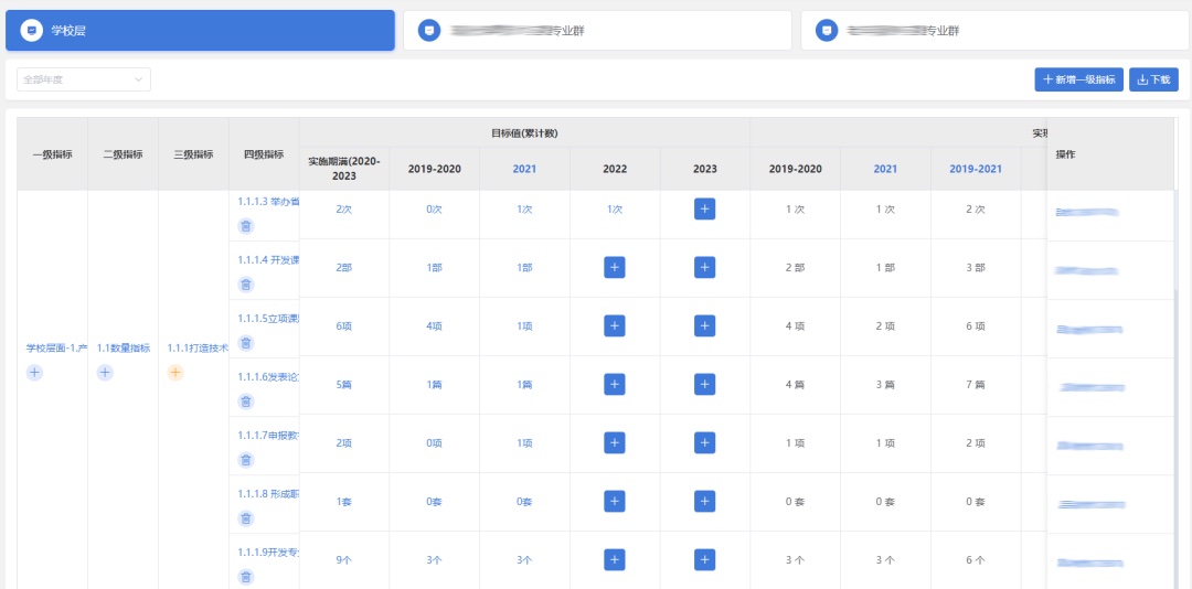 平臺以教育部績效考核目標為抓手,輔助學校年度雙高績效考核,為學校撰寫年度、中期及實施期結束后的自評報告提供了信息化手段,助力形成“雙高計劃”項目動態(tài)管理機制和“雙高校”自評自省。