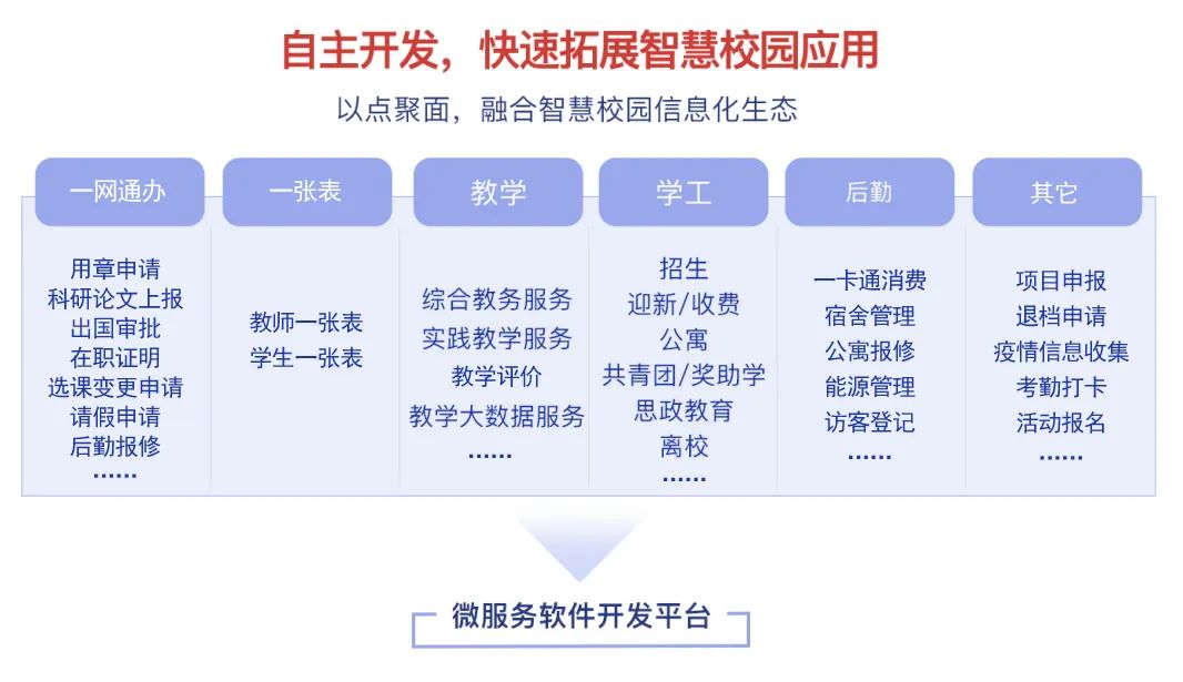 強(qiáng)智微服務(wù)軟件開發(fā)平臺(tái),作為生產(chǎn)力服務(wù)工具,向上可以快速打造面向場景的微應(yīng)用,向下對(duì)平臺(tái)能力進(jìn)行快速整合,覆蓋了教學(xué)、學(xué)工、科研、人事、資產(chǎn)、后勤等各類校園業(yè)務(wù)的全應(yīng)用場景,為高校打造智慧化校園提供了建設(shè)能力。
