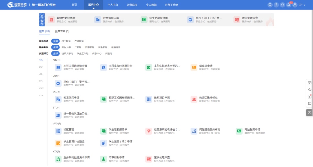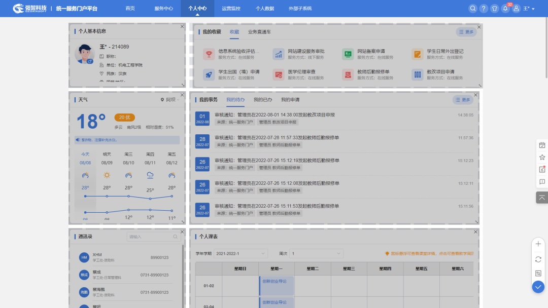 運(yùn)用新興信息技術(shù),基于統(tǒng)一身份認(rèn)證、統(tǒng)一服務(wù)門戶和數(shù)據(jù)中心,聚合各類應(yīng)用系統(tǒng)和微場(chǎng)景服務(wù),可拓展黨政類、財(cái)務(wù)類、人事類、教務(wù)類、學(xué)工類、教輔類等20多個(gè)類別,300多個(gè)微應(yīng)用,師生無(wú)需輾轉(zhuǎn)各個(gè)業(yè)務(wù)系統(tǒng),就可以在PC端和移動(dòng)端一站式查看、審批、申辦各類業(yè)務(wù)和跨部門協(xié)同,真正實(shí)現(xiàn)“一網(wǎng)通辦,一次不用跑”!