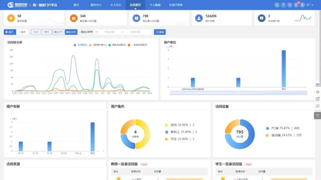 通過(guò)平臺(tái)運(yùn)營(yíng)監(jiān)控可視化窗口,提供整體運(yùn)營(yíng)數(shù)據(jù)統(tǒng)計(jì):服務(wù)總量、服務(wù)累積訪問(wèn)量、網(wǎng)站累計(jì)訪問(wèn)量、用戶總數(shù)、在線用戶數(shù)、24小時(shí)在線用戶趨勢(shì)等;以及訪問(wèn)數(shù)據(jù)統(tǒng)計(jì):訪問(wèn)量分析、訪問(wèn)用戶單位/年齡/角色分布、訪問(wèn)設(shè)備分布、訪問(wèn)來(lái)源分布、師生一張表訪問(wèn)量top、服務(wù)訪問(wèn)量top等等。