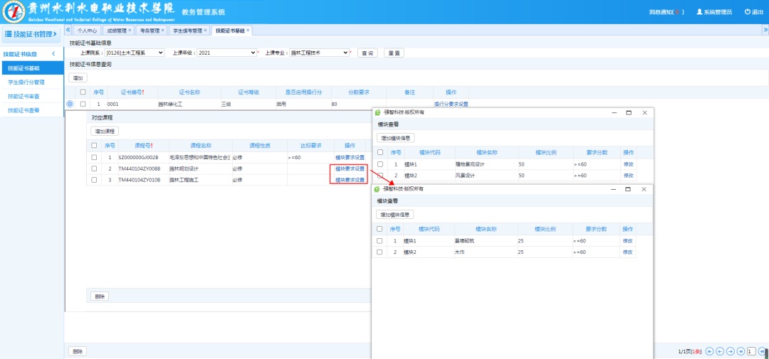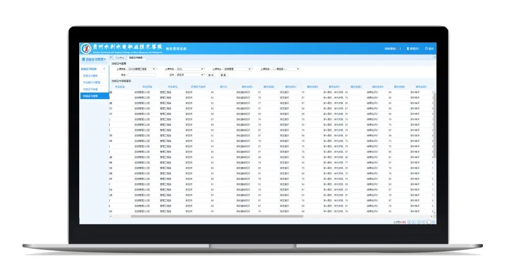 為落實(shí)學(xué)生“雙證書”行動(dòng)試點(diǎn)工作,構(gòu)建模塊化課程成績與職業(yè)技能認(rèn)定互通的管理系統(tǒng),提高雙證書過程性評價(jià)信息化管理水平,貴州水利水電職業(yè)技術(shù)學(xué)院與強(qiáng)智科技合作,在教務(wù)核心系統(tǒng)之外,進(jìn)行雙證書管理小子彈(微應(yīng)用)的開發(fā)。