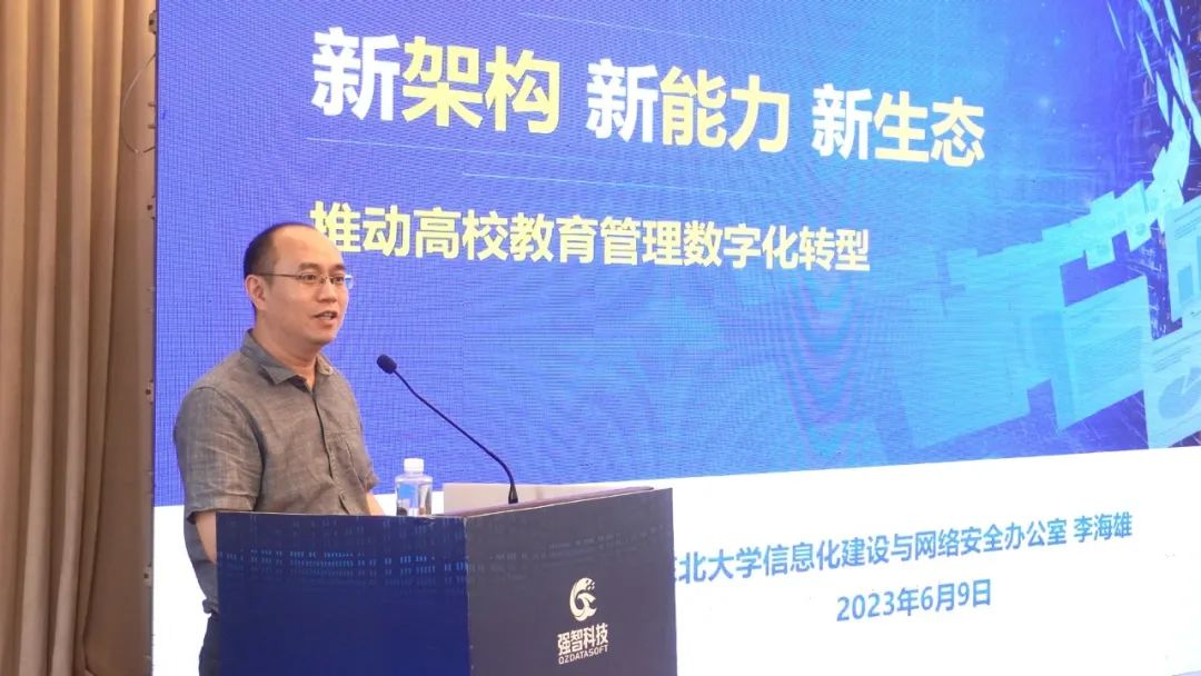 東北大學信息化建設與網絡安全辦公室主任李海雄發(fā)表了題為《新架構 新能力 新生態(tài)—— 推動高校教育管理數(shù)字化轉型》的主題報告。他深入探討了當前數(shù)字化轉型的時代背景,分享了東北大學如何從新架構、新能力、新生態(tài)三個方面開展數(shù)字化轉型之路,雙方共同建設的智慧校園一體化服務平臺,幫助學校實現(xiàn)海量微應用服務開發(fā),助力學校在信息化建設的道路上更進一步!