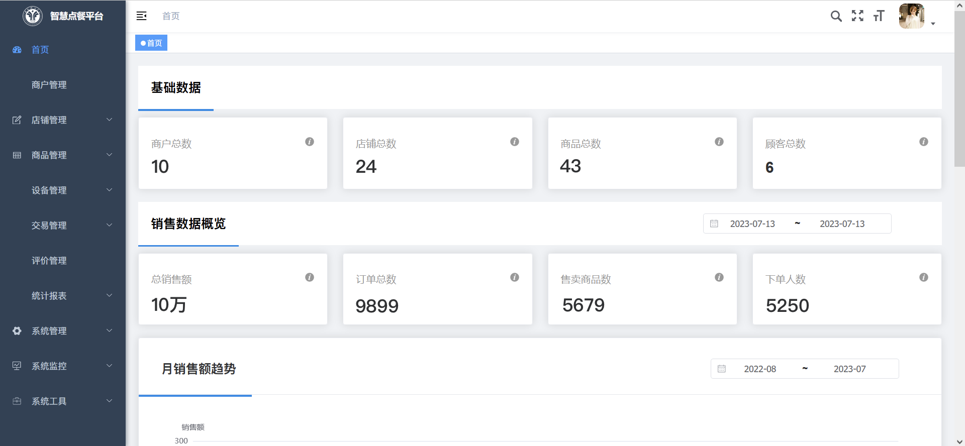 如:基礎(chǔ)數(shù)據(jù)、銷售數(shù)據(jù)概覽、月銷售額趨勢(shì)、銷售額店鋪類別占比、店鋪銷售額排名的每日、每月數(shù)據(jù)可視化查看。