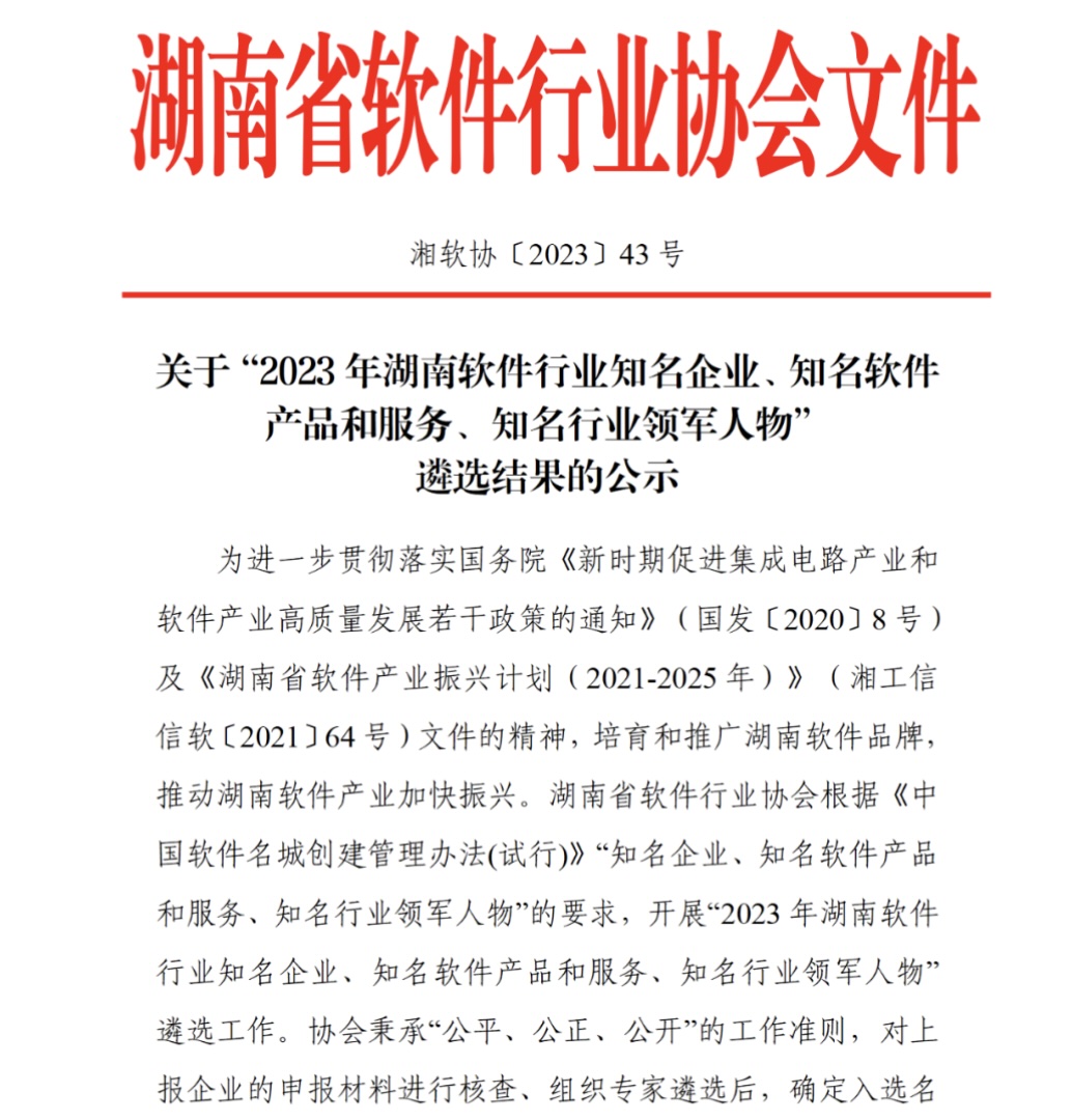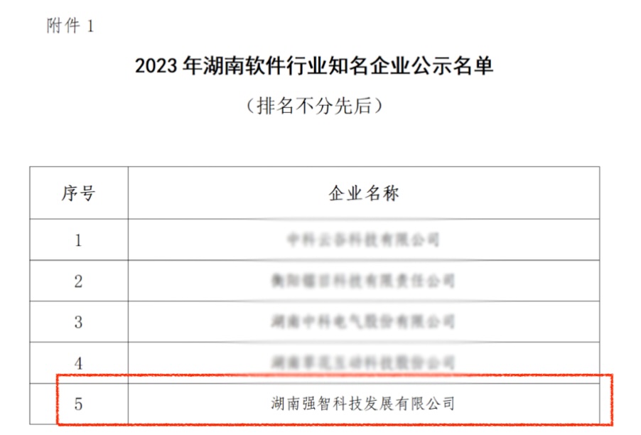 2023年12月10日,湖南省軟件行業(yè)協(xié)會(huì)對(duì)“2023年湖南軟件行業(yè)知名企業(yè)、知名軟件產(chǎn)品和服務(wù)、知名行業(yè)領(lǐng)軍人物”遴選結(jié)果進(jìn)行公示,經(jīng)嚴(yán)格核查、組織專(zhuān)家遴選,強(qiáng)智科技入選“2023年湖南軟件行業(yè)知名企業(yè)”,教學(xué)評(píng)價(jià)管理系統(tǒng)V1.0入選“2023年湖南軟件行業(yè)知名軟件產(chǎn)品和服務(wù)”。