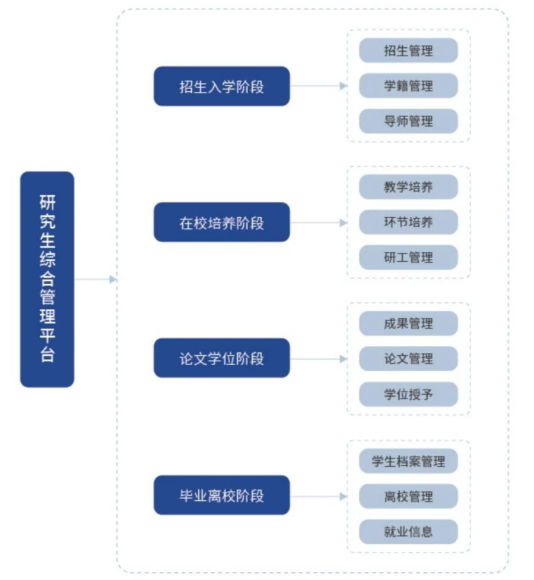 強智研究生綜合管理平臺為各研究生院和科研院所提供從招生入學(xué)、在校培養(yǎng)、學(xué)位申請、畢業(yè)離校,以及產(chǎn)教融合育人、本研一體化管理等一站式、全流程的信息化服務(wù),實現(xiàn)研究生業(yè)務(wù)由管理向服務(wù)轉(zhuǎn)變。
