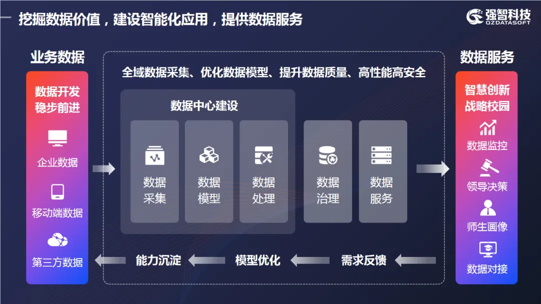 強智科技助力學(xué)校完善數(shù)據(jù)標(biāo)準(zhǔn)管理、數(shù)據(jù)質(zhì)量管理、數(shù)據(jù)安全保護(hù)、數(shù)據(jù)共享與開放等,覆蓋數(shù)據(jù)的全生命周期,從數(shù)據(jù)的采集、存儲、處理、分析和應(yīng)用等各個環(huán)節(jié),通過校本數(shù)據(jù)中心,涵蓋職業(yè)學(xué)?;巨k學(xué)條件、專業(yè)設(shè)置、課程開設(shè)、師生信息、企業(yè)信息等基礎(chǔ)數(shù)據(jù),打造校本綜合平臺,強化數(shù)據(jù)無感采集、全量匯聚、智能分析能力,提升數(shù)據(jù)治理能力和水平。