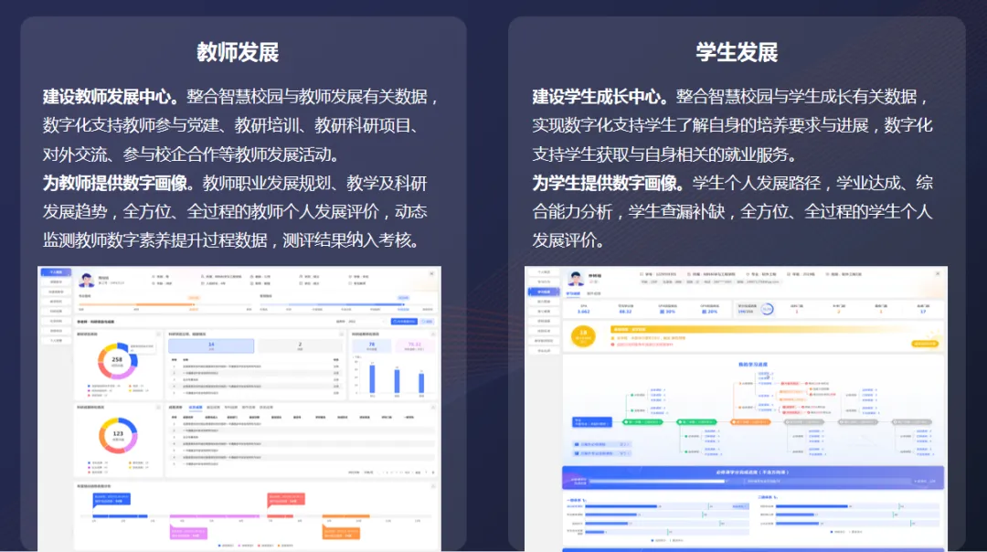 幫助學(xué)校建立師生發(fā)展中心,構(gòu)建師生數(shù)字畫像,打造全方位、全過程的師生個人發(fā)展評價體系。