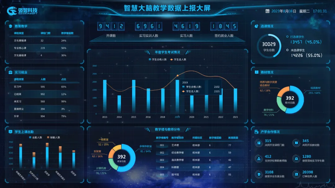 幫助學(xué)校建立智慧校園決策分析平臺,整合學(xué)校各業(yè)務(wù)系統(tǒng)所產(chǎn)生的各類數(shù)據(jù),繪就辦學(xué)條件、教師能力、學(xué)生發(fā)展、社會服務(wù)等可視化圖譜,為管理者提供全面直觀的分析圖表,推動學(xué)校教育科學(xué)決策、精準(zhǔn)管理和個性服務(wù)。